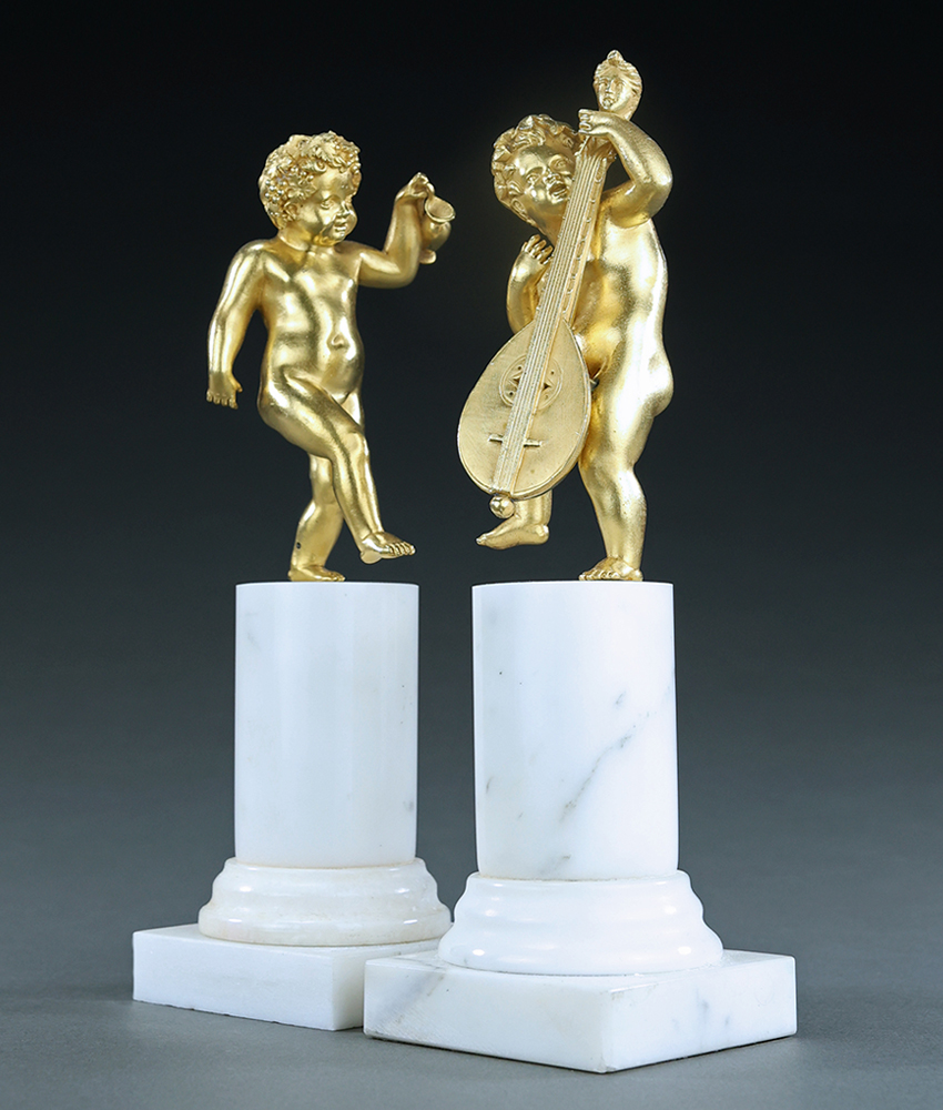 Delightful pair of fine quality classically inspired 19th century, probably French, gilt bronze ormolu putti dancing a bacchanal on white marble columns. Possibly a matched pair, well cast and chased.