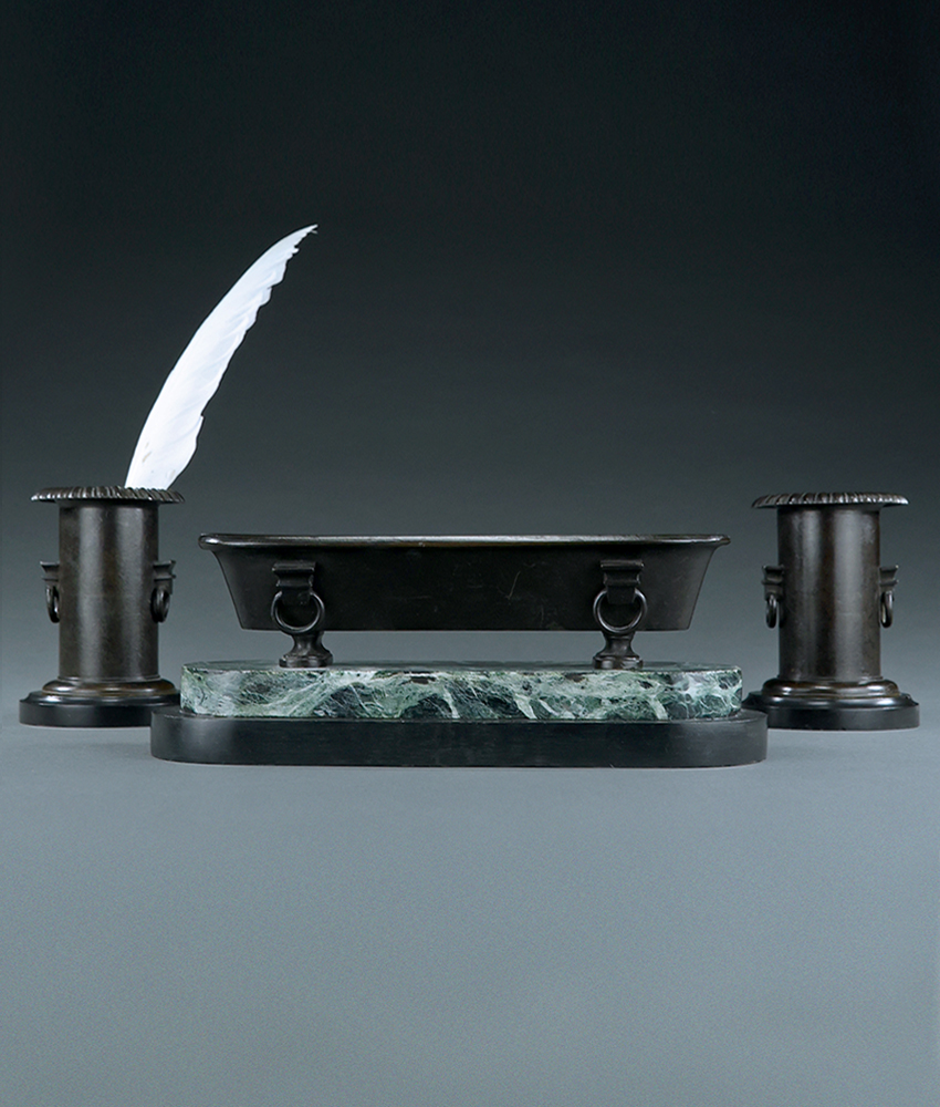 Very rare early 19th century English Regency Grand Tour style patinated bronze and marble desk set in the form of a classical Roman bath and two cistern spill vases or pen pots with seperately cast free hanging ring handles in the manner of Vulliamy. Set on possibly later marble bases. Very rare to find a complete set of three items. Well cast deep dark patina. English, circa 1820.