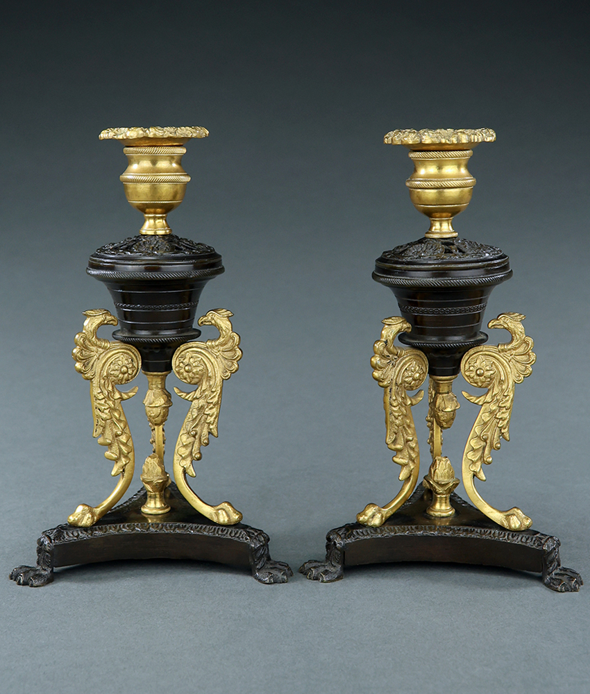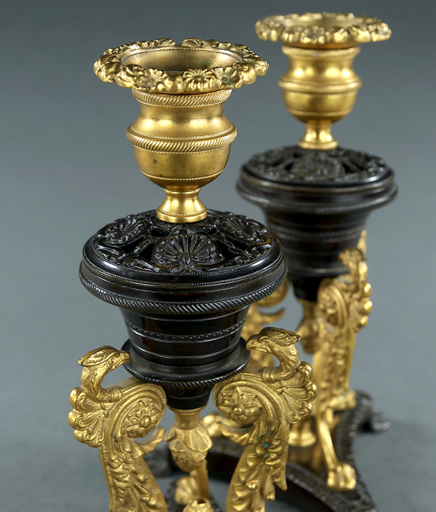 Attractive unusual pair of early 19th century English Regency patinated and gilt bronze ormolu candlesticks with seemingly small pot pourri holders after designs by Cheney of London. Typical Regency style candle cups with engine turned band and floral rimmed bobeches sit upon a fret cut pot pourri style urn with shell decoration with a pine cone finial. Three zoomorphic monopodiae exotic bird legs on a lion footed triform base. Good quality, very attractive pair of candlesticks. English, circa 1815.