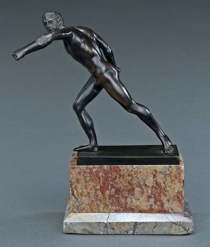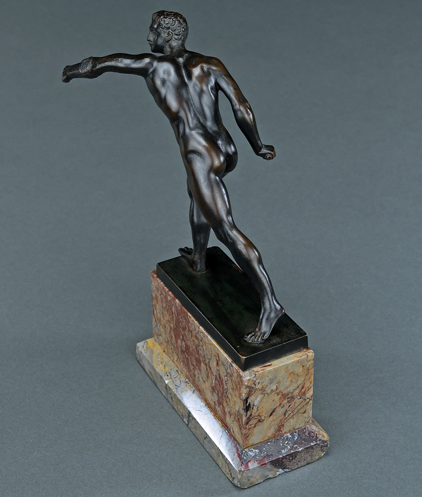 Early 19th Century Grand Tour patinated bronze of the Borghese Gladiator, after the Hellenistic original statue discovered by Cardinal Scipion Borghese in the early 17th Century. Good quality casting, dark patination presented on an interesting two tone Breccia marble block base. In 1808, the original statue left Italy for the Louvre, following the purchase of the collection of Prince Camille Borghese by Napoleon. Attractive mid size bronze of the statue described as the perfect example of the male nude in motion. Italy, circa 1830.