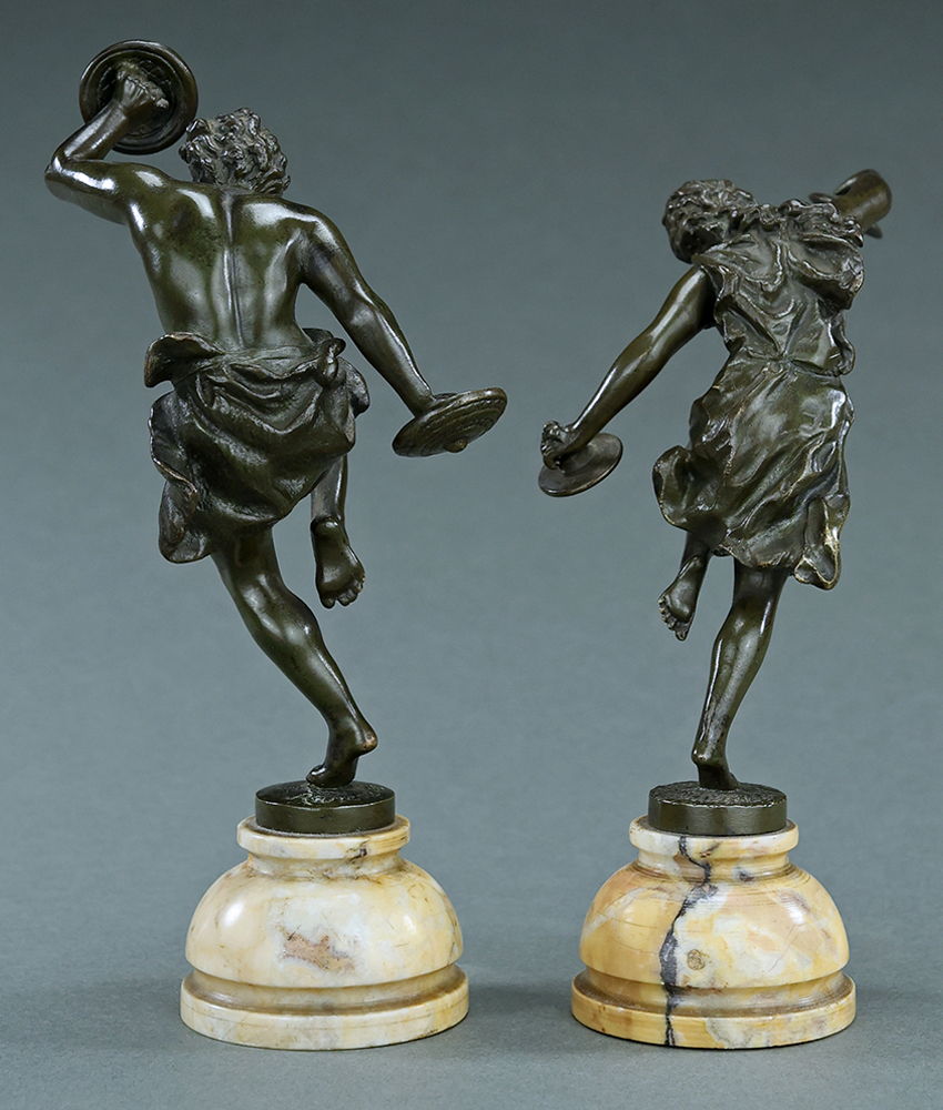 Fine quality pair of late 19th century patinated bronze statuettes of cavorting Bacchanalian revellers by Ernest Rancoulet (1870 - 1915). Fantastic sense of movement and abandon. Signed 'Rancoulet' to the bases of the figures. Presented on nicely figured Sienna marble domed bases. France, circa 1900.