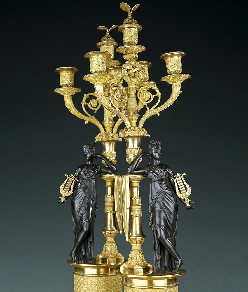 Impressive, extremely fine, large scale pair of bronze French early 19th century Empire period gilt and patinated bronze four light candelabra. Beautiful latticed column bases with standing classical female figures holding lyres and leaning on a central torchere with hanging drapery and urn. Three branches issue from the flower filled urn and a central stem with a floral wreath and ribbons. Finely decorated candle cups and central floral snuffers with butterfly atop. Rare superb quality, very attractive seldom seen candelabra. French, circa 1810.