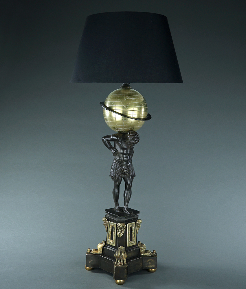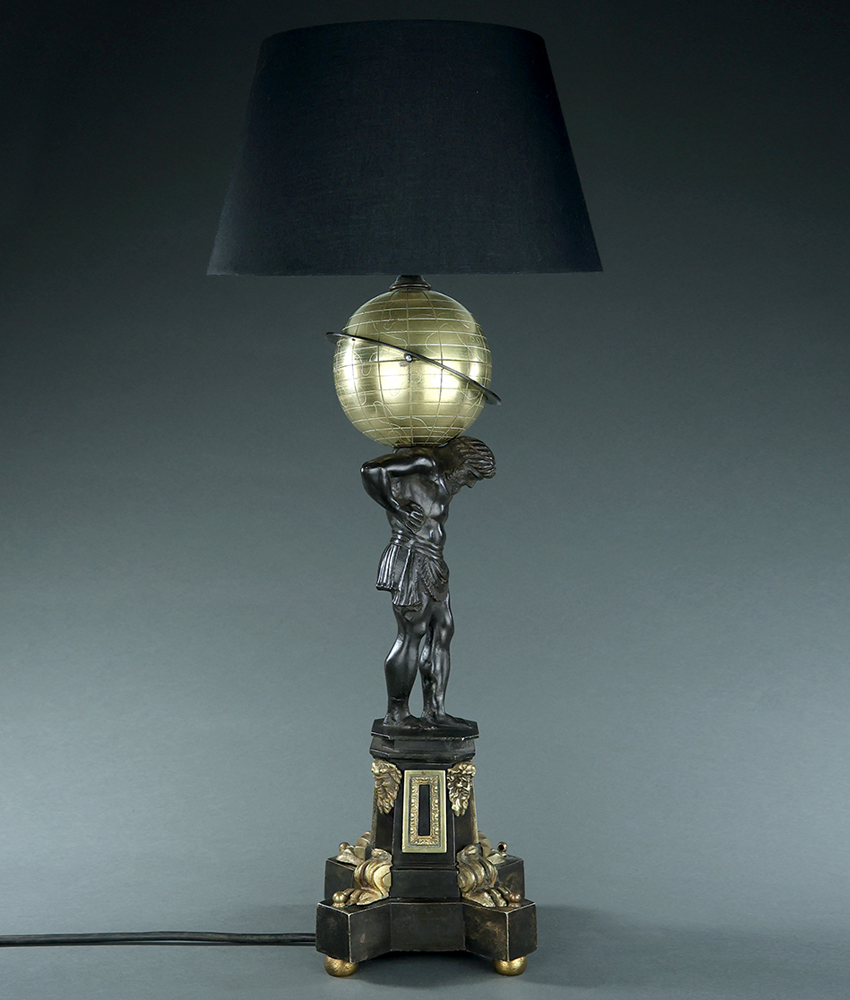 Fascinating 19th century William IV period English dark patinated and gilt bronze early lamp depicting Atlas holding up the earth possibly by Thomas Messenger. Octagonal plinth base with applied satyr mask mounts. Adapted for electricity probably in the early 20th century. A version of this model with an earlier globe can be seen in Room 609, Sully wing, Louvre, Paris which was aquired from the collection of notable French antiquitarian Nicolas Landau. England, circa 1835.