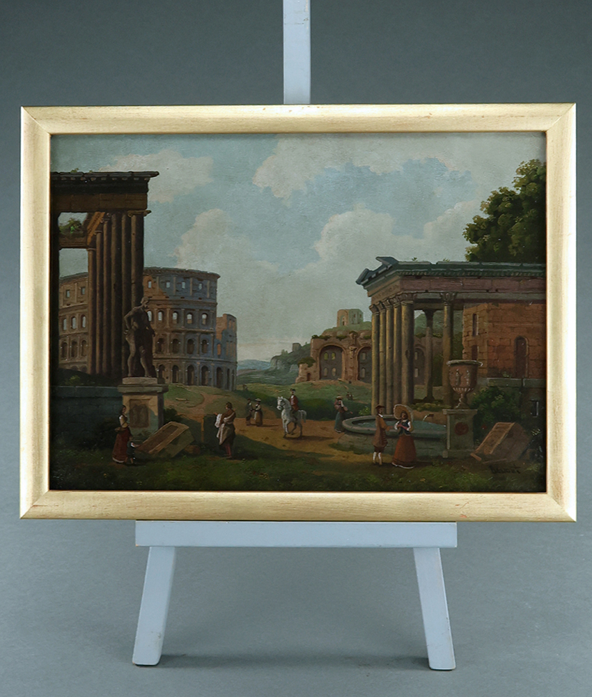 Interesting pair of probably early 20th century Italian Grand Tour oil on panel cappricios in the manner of Paolo Panini by Eugenio Benvenuti (1881-1959). Typically crammed with the visual delights of ancient Rome. Benvenuti was an artist that usually worked in watercolour but these seem stylistically to be gouache paintings perhaps with a later oil varnish. Sold at auction as oil on panel. Italy, circa 1920.