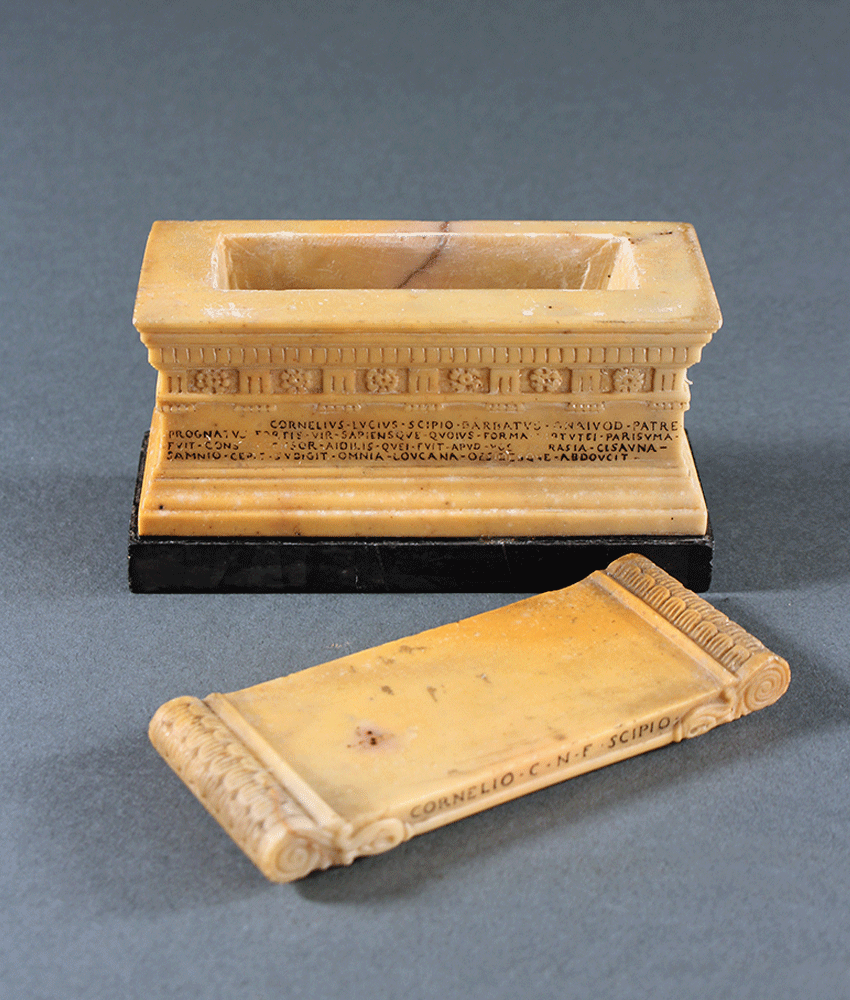 A fine and rare example of a small early 19th century Grand Tour Siena marble model of the Tomb of Scipio, after the original now housed in the Vatican Museums in Rome. Hand painted dedication to the front and a removable lid to expose a single compartment, possibly used as a travelling or campaign desk tidy or inkwell. Siena marble on a black marble base. Circa 1820.