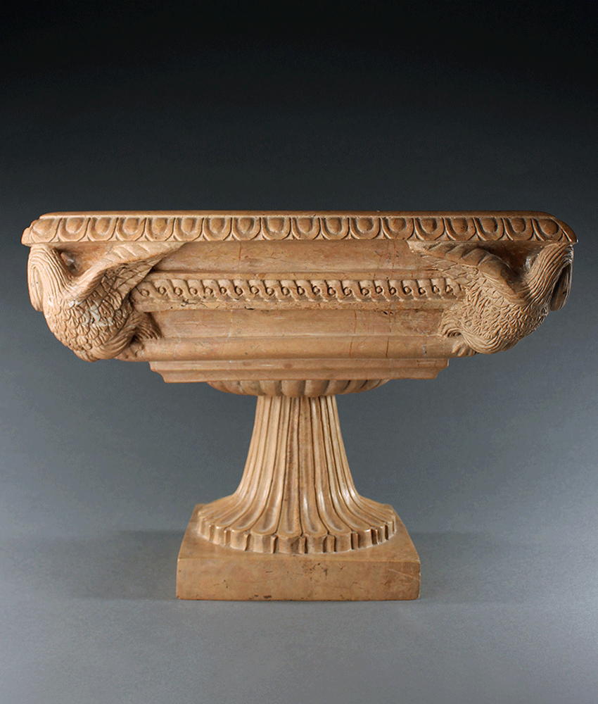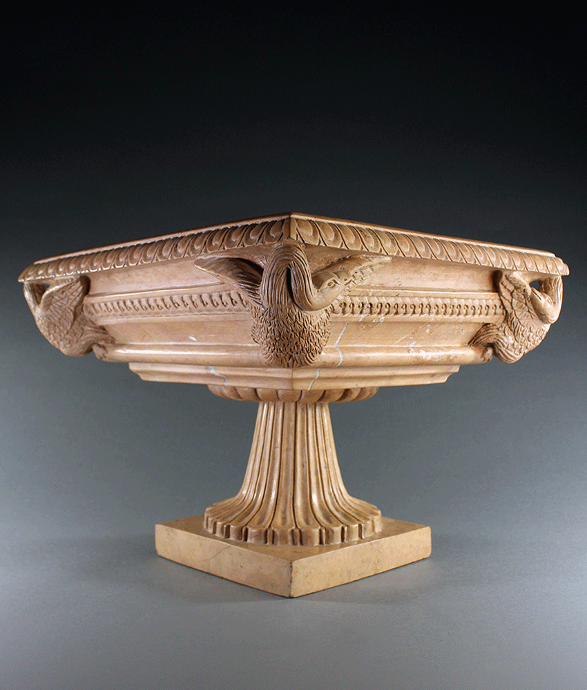 A labrum was a water vessel used in ancient Roman baths and gardens. A very similar larger version can be seen in the 'Gabinetto delle Maschere' in the Vatican Museum in Rome. Carved block base with a fluted spreading stem. Stepped square form bowl with a lobed ribbed underside. Stylised central flower and a classical egg and dart style rim. Carved swans on each corner. Good example of a rare Grand Tour item.