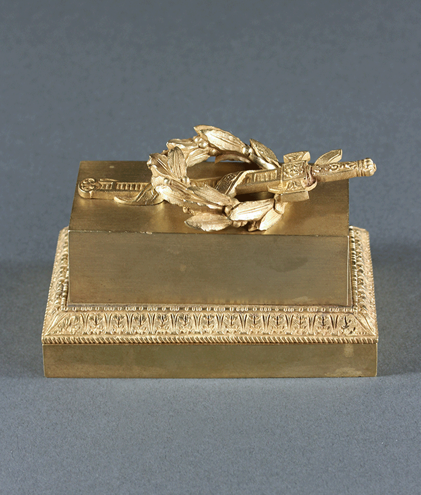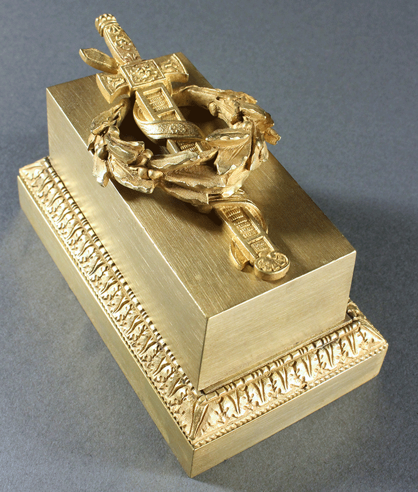 Superb small French Empire early 19th century bronze ormolu campaign inkwell surmounted by a classical victors laurel crown and a sword after the antique. Original pounce pot and black ceramic ink pot.