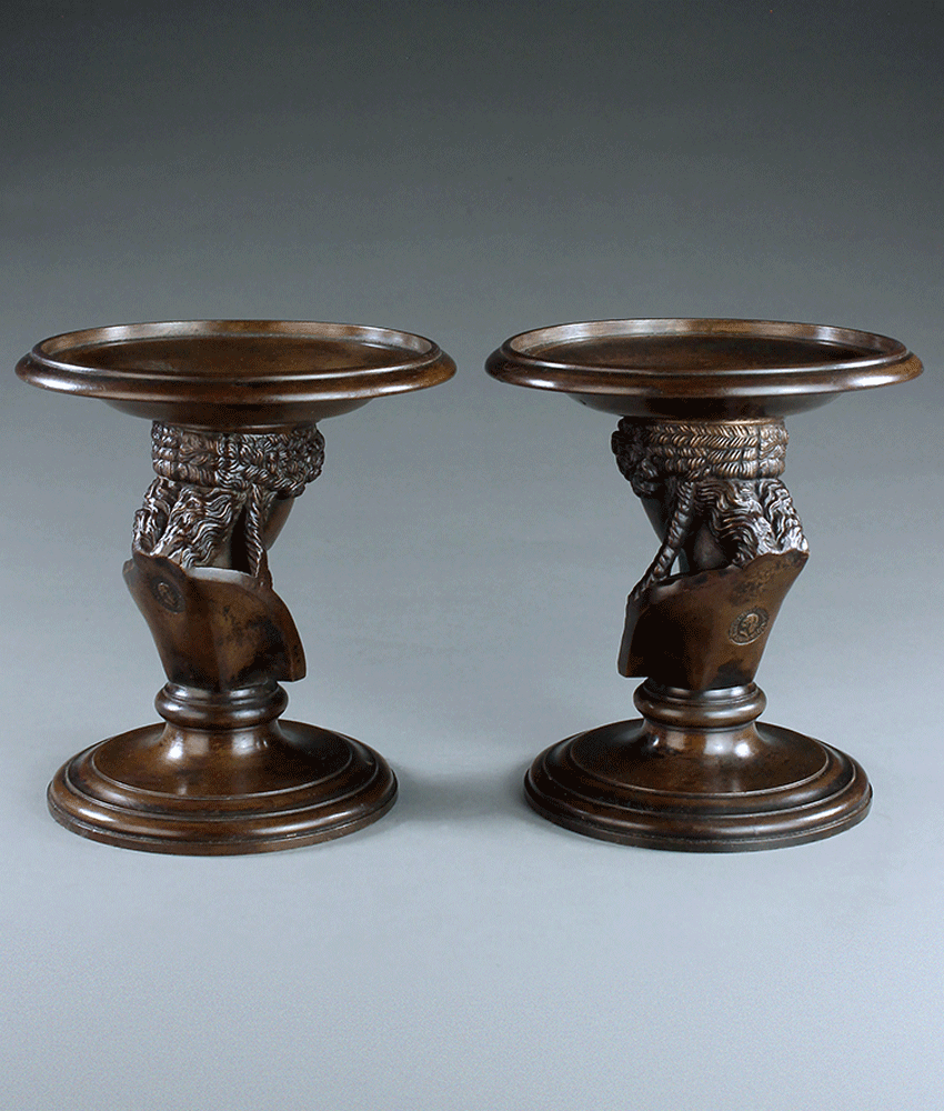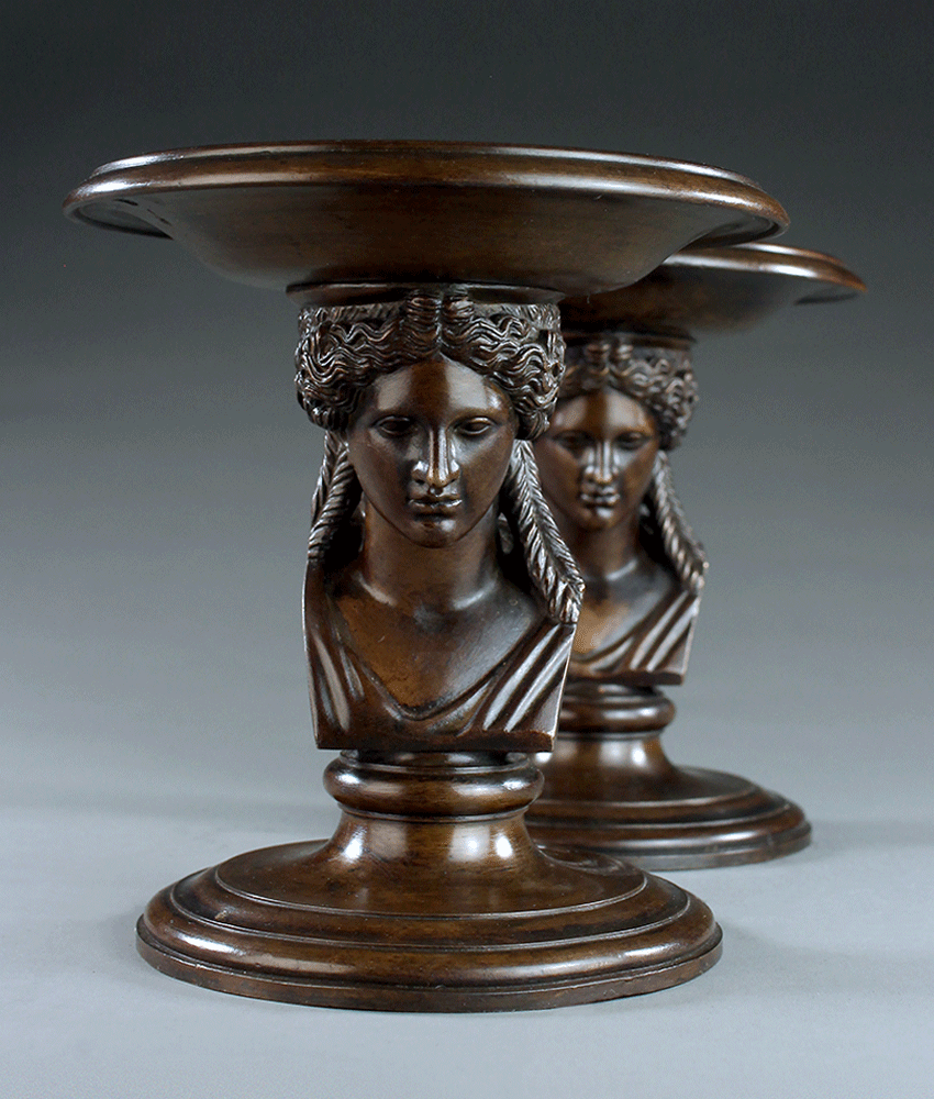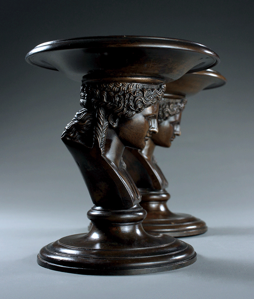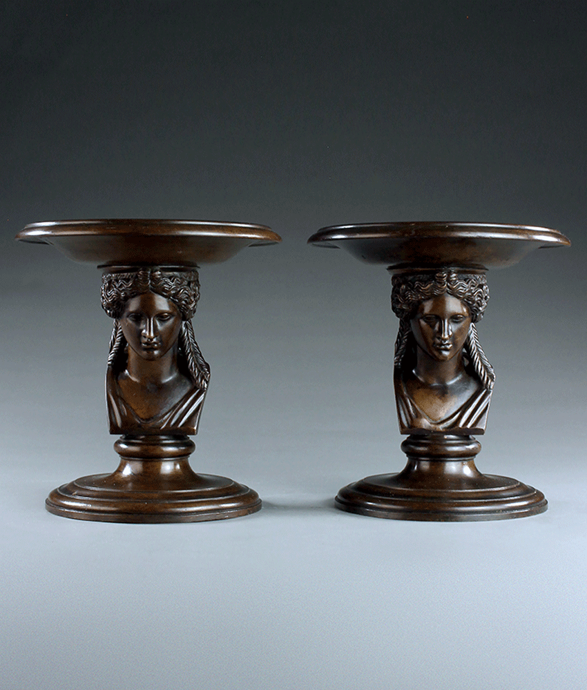Beautiful, fine quality pair of Grand Tour patinated bronze Neoclassical tazzas or 'vide poches', after the antique. The busts, often referred to as Athéniennes, are inspired by the Greek caryatids of the Erechtheion on the Acropolis in Athens. Stamped with the 'Reduction Merchanique seal of Achille Collas' to the reverse. French, circa 1870.
