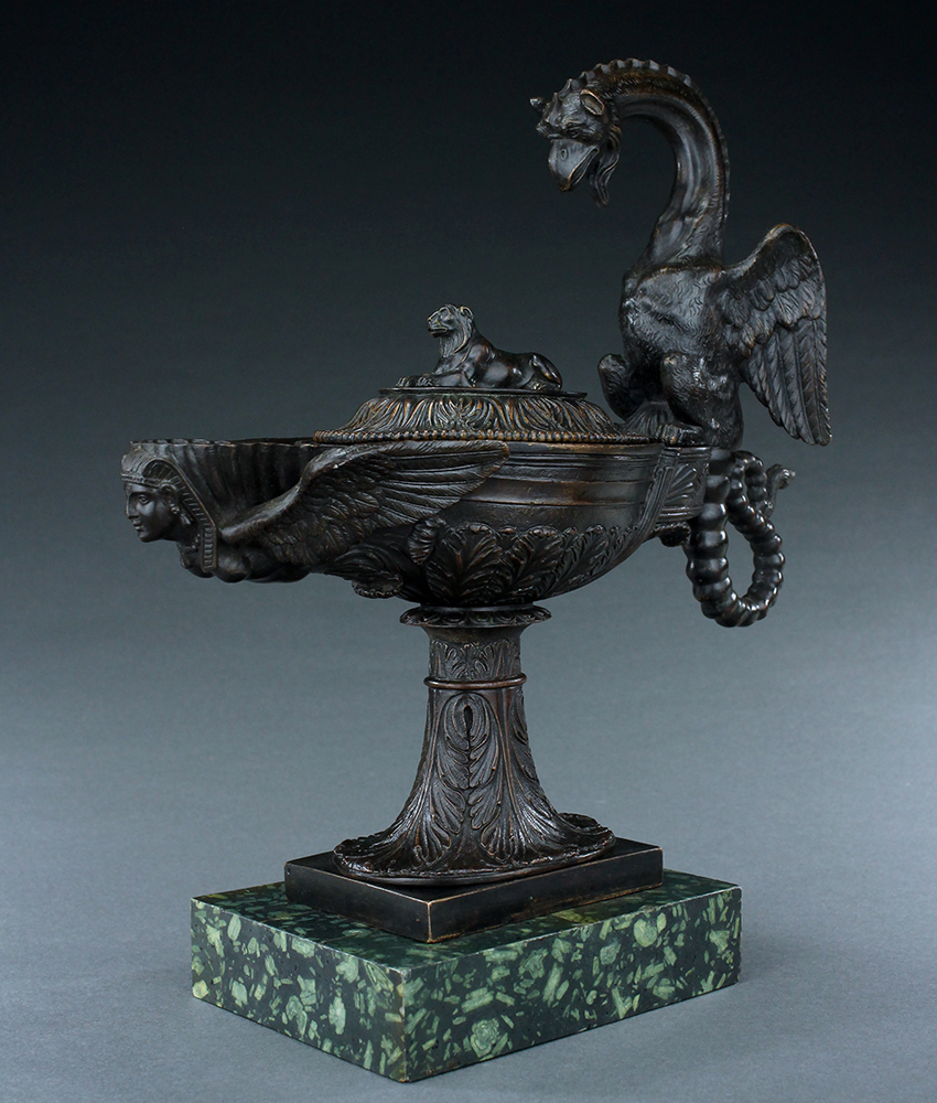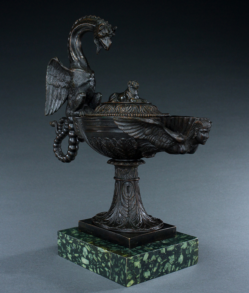 Very rare and beautiful mid 19th century Grand Tour neoclassical patinated bronze lucerna or library lamp signed B. Boschetti Roma. Benedetto Boschetti was central to the growing demand for high quality works of art created by the growing interest in the Grand Tour in Rome during the 19th century. Little is known about his life, but he is known to have produced a large number of classically inspired objects ranging from bronzes to table tops and mosaics. Active between 1820-1870, Boschetti exhibited at the Crystal Palace Exhibition in 1851. His workshop was renowned for the exceptional quality of its copies 'after the Antique', mainly in marble and bronze. Cast in four sections: the lid is surmounted by a Capitoline egyptian lion, the reservoir of the lamp has a classical foliate design to the underside and a winged egyptian female burner spout, the handle is in the form of a finely cast griffin, the socle classically inspired foliate stem signed B. Boschetti Roma. Green porphyry block base. Italy, Rome, circa 1850.