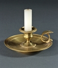 Classic 19th century French Empire gilt bronze chamber stick with machined and chased Empire period designs and a handle in the form of a curling leaf. French, circa 1840.