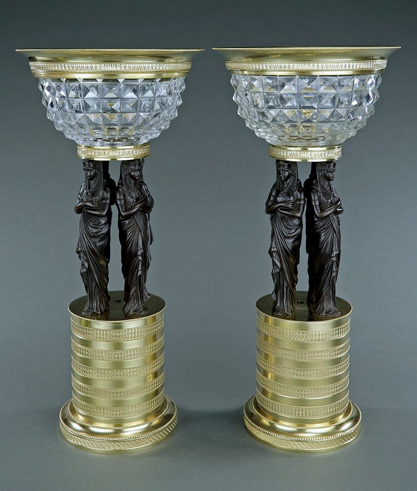Stunning, rare pair of 19th century French Retour d'Egypte bronze and cut glass centrepieces or surtout de table. Four fine quality patinated bronze Egyptian cayatids supporting the diamond cut glass bowls standing on a column base with machined Empire designs. Super pair with that understated elegance of the early 19th century. Converted to electricity at some point in the early 20th century they have now been returned to their original purpose. Seldom seen these would look great not just on a table but on a mantel shelf or credenza. France, circa 1840.