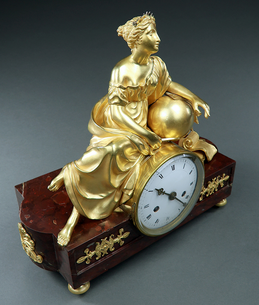 Rare early 19th Century French Empire period fire gilt bronze ormolu and red Rouge Griotte marble clock surmounted by a superb model of Urania the daughter of Zeus and the goddess of astronomy and navigation. Shown seated in classical robes with a celestial globe, maps, parchment and books. Ormolu mounts to the front and sides. Unsigned enamel dial, eight day silk suspension movement. Star diadem is a later replacement. A rare clock. French, circa 1820.