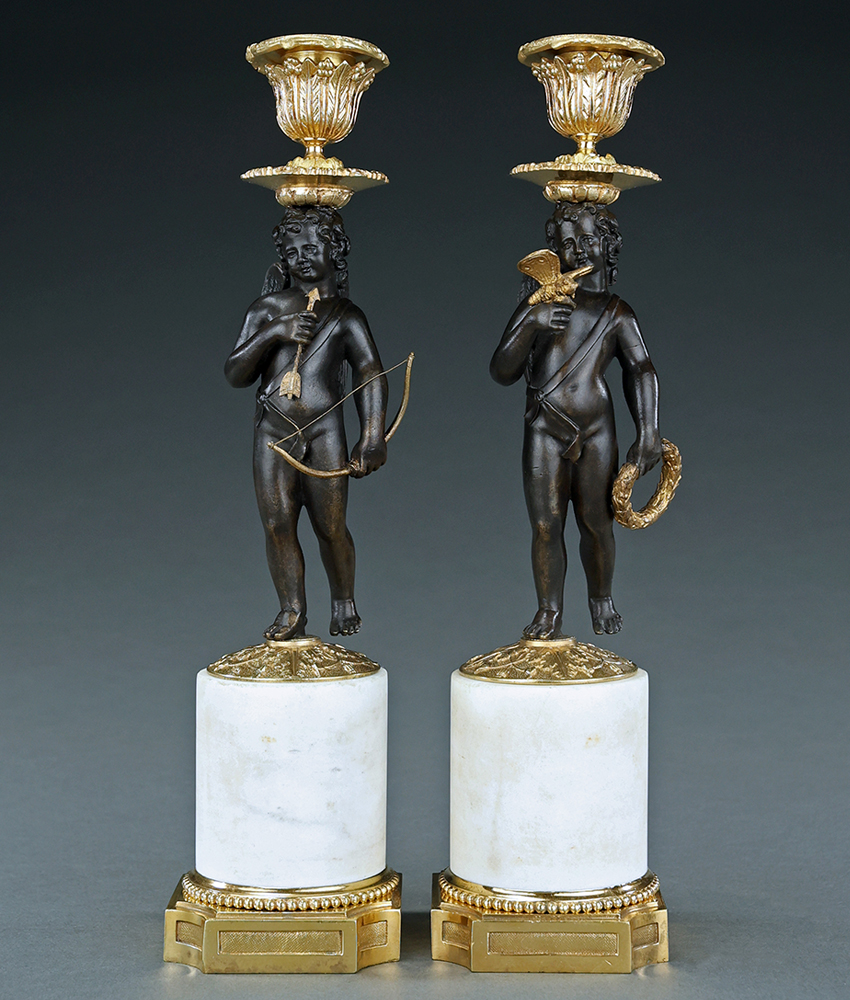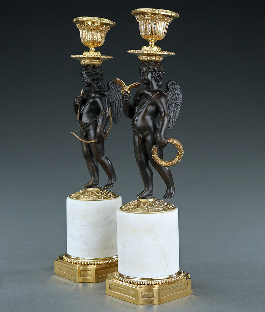 Attractive and rare pair of Louis XVI style early 19th century French marble, patinated and gilt bronze figural cupid candlesticks. Elegant classically inspired white marble and gilt bronze ormolu mounted column bases surmounted by deep dark almost black patinated bronze figures of Cupid holding representations of love - a bow and arrow, and a victor's wreath and butterfly. Beautifully cast candle cups with vine and floral decoration. French, circa 1820.