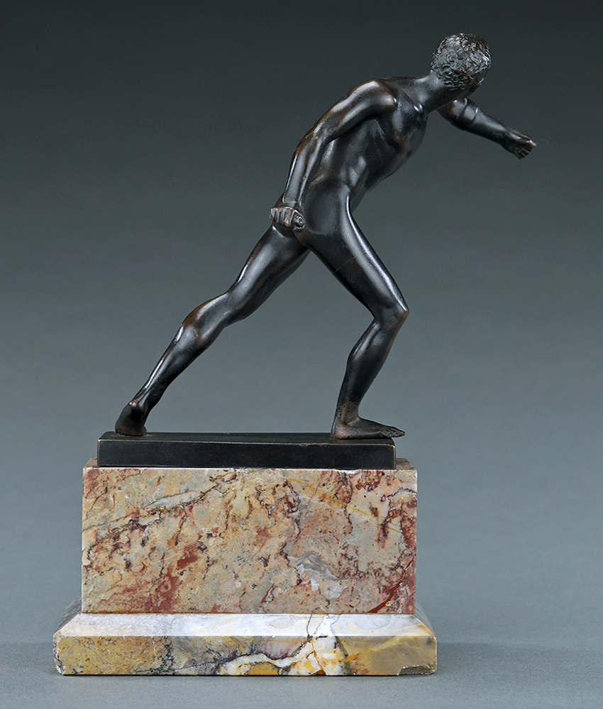 Early 19th Century Grand Tour patinated bronze of the Borghese Gladiator, after the Hellenistic original statue discovered by Cardinal Scipion Borghese in the early 17th Century. Good quality casting, dark patination presented on an interesting two tone Breccia marble block base. In 1808, the original statue left Italy for the Louvre, following the purchase of the collection of Prince Camille Borghese by Napoleon. Attractive mid size bronze of the statue described as the perfect example of the male nude in motion. Italy, circa 1830.