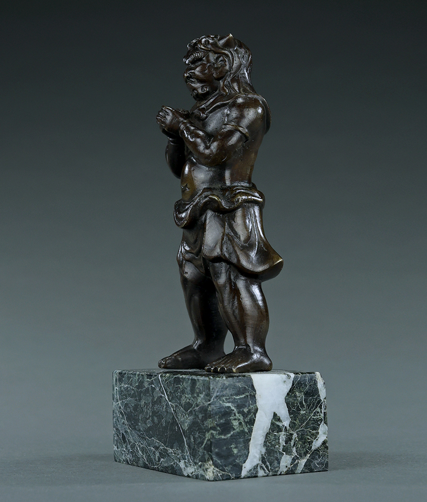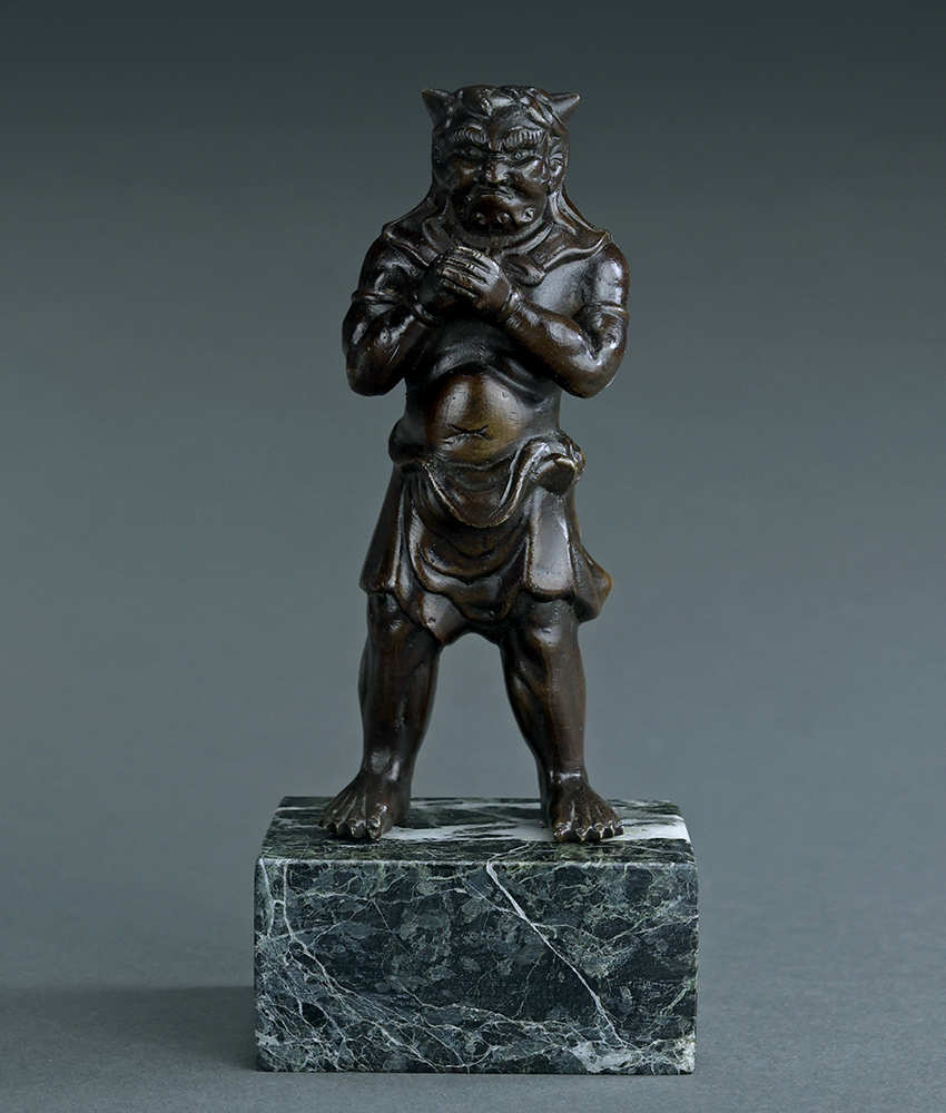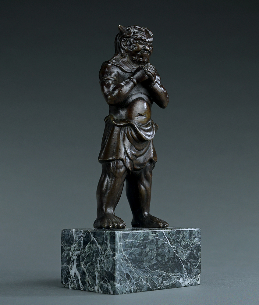 Good quality late Meiji period (1868-1912) patinated bronze statue of a Japanese standing mythical Oni demon presented on a later substantial green marble block base. Modelled with small horns to his head, a scowling face standing legs apart with clawed feet wearing a fundoshi. Well cast with a deep rich patina. Japan, circa 1900.