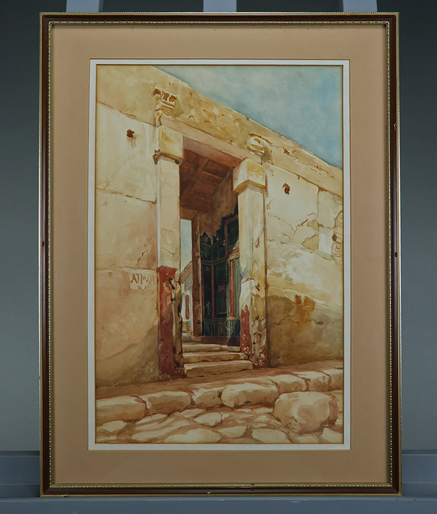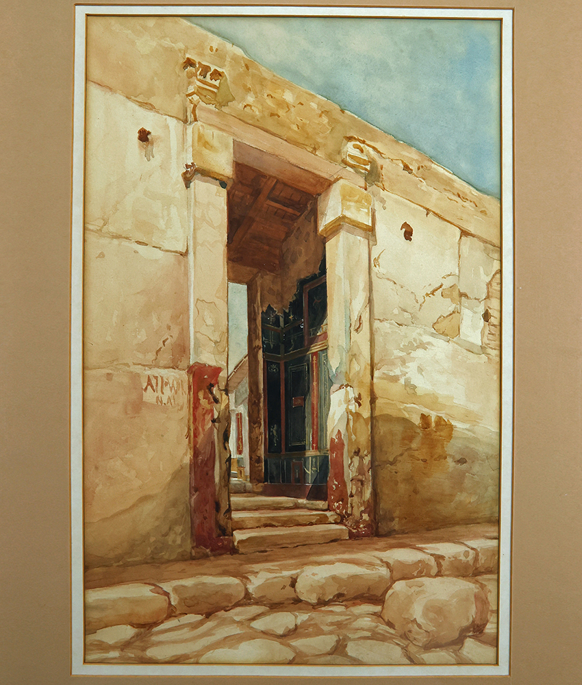 Fine late 19th century watercolour of the doorway to the House of the Vetti, Pompeii, in the manner of Luigi Bazzani. Bazzani (1836-1927) also called Il Bazzanetto, was an Italian painter, illustrator, and watercolorist. Inspired by the rediscovery of Pompeii in 1748, he spent 35 years of his life from approximately 1880 to 1915 documenting the ruins of the ancient city. Named after its owners, two successful freedmen: Aulus Vettius Conviva and Aulus Vettius Restitutus the House of Vetti is located in region VI, in Pompeii, near the Vesuvian Gate, bordered by the Vicolo di Mercurio and the Vicolo dei Vettii. The house is one of the largest domus in Pompeii, spanning the entire southern section of block 15 and has many preserved frescoes. Italy, circa 1890.