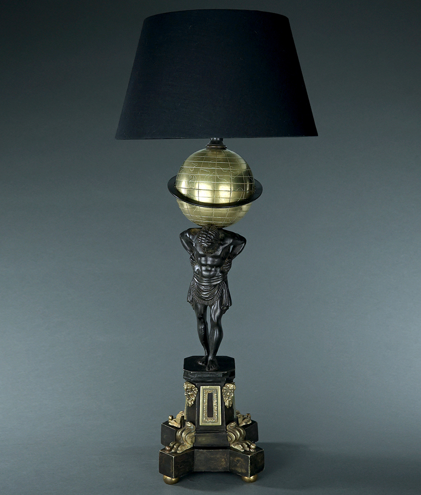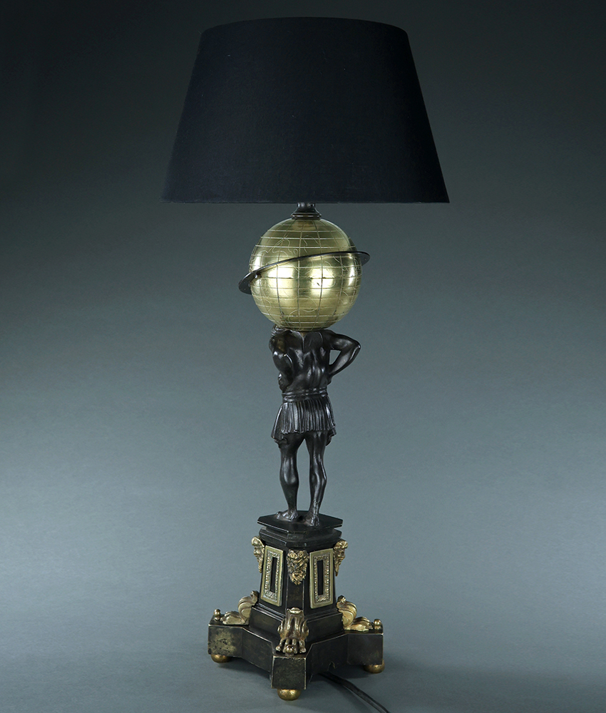 Fascinating 19th century William IV period English dark patinated and gilt bronze early lamp depicting Atlas holding up the earth possibly by Thomas Messenger. Octagonal plinth base with applied satyr mask mounts. Adapted for electricity probably in the early 20th century. A version of this model with an earlier globe can be seen in Room 609, Sully wing, Louvre, Paris which was aquired from the collection of notable French antiquitarian Nicolas Landau. England, circa 1835.