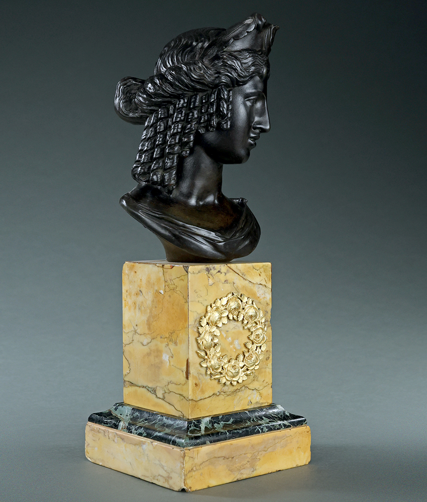 Fine and very rare French 19th Century Grand Tour rich dark patinated bronze portrait bust of the goddess Isis, after the late 2nd Century AD Roman marble original in the Musée du Louvre in Paris. Superbly detailed bronze of a little known bust fragment which would add real depth to any Grand Tour collection. Presented on a typical mid 19th century Sienna marble block base with a green marble architrave and a gilt bronze ormolu floral wreath mount. France, circa 1860.