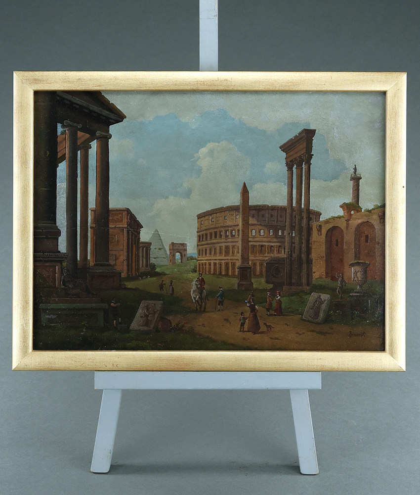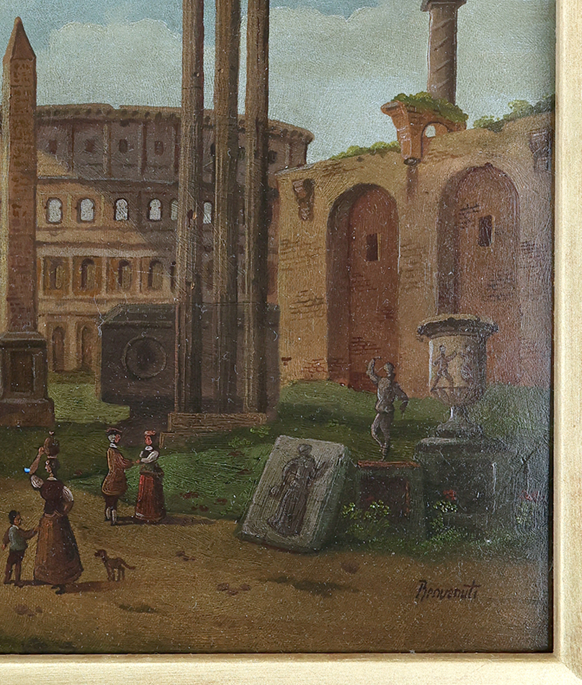 Interesting pair of probably early 20th century Italian Grand Tour oil on panel cappricios in the manner of Paolo Panini by Eugenio Benvenuti (1881-1959). Typically crammed with the visual delights of ancient Rome. Benvenuti was an artist that usually worked in watercolour but these seem stylistically to be gouache paintings perhaps with a later oil varnish. Sold at auction as oil on panel. Italy, circa 1920.