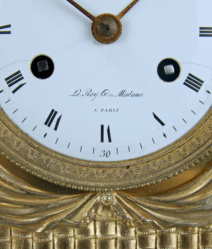Early 19th century French Empire period 'La Liseuse' or 'La Lectura' gilt bronze ormolu and marble mantel clock. Surmounted by a standing figure of a young woman reading a book leaning on a bookcase, after an original model by Jean-André Reiche (1752-1817). A successful and popular theme, this depiction of a woman reading epitomised the ideals of the enlightment, of learning and knowledge visually rienforced by the armillary sphere placed on a classical column - very Empire. Unusual white marble base. White enamel dial signed 'Le Roy Hr de Madame à Paris' for the horologer Basile Charles Le Roy. Based in his workshop in the Palais Royale he was one of the most important central figures of the Le Roy dynasty. Madame is a reference to Her Imperial Highness Letizia Bonaparte, 'Madame Mère', the mother of the Emperor Napoleon. This form of signature dates this clock to between 1805 to 1817. Silk suspension movement stamped 'L:431'. Interesting version of a popular clock from an important workshop. France, Paris, circa 1810.