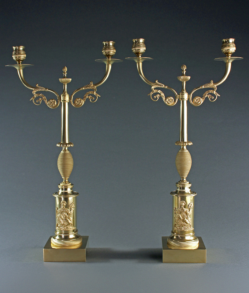 A fine pair of early 19th century Swedish classically inspired two branch Empire period gilt bronze candelabra. Two branches with floral arms attached to a central stem with a beautiful, delicate bee hive design base atop columns decorated with an ormolu depiction of the Allegory of Europe, with her cornucopia astride a stallion from the series of the four continents. Block bases. Swedish, first quarter 19th century.