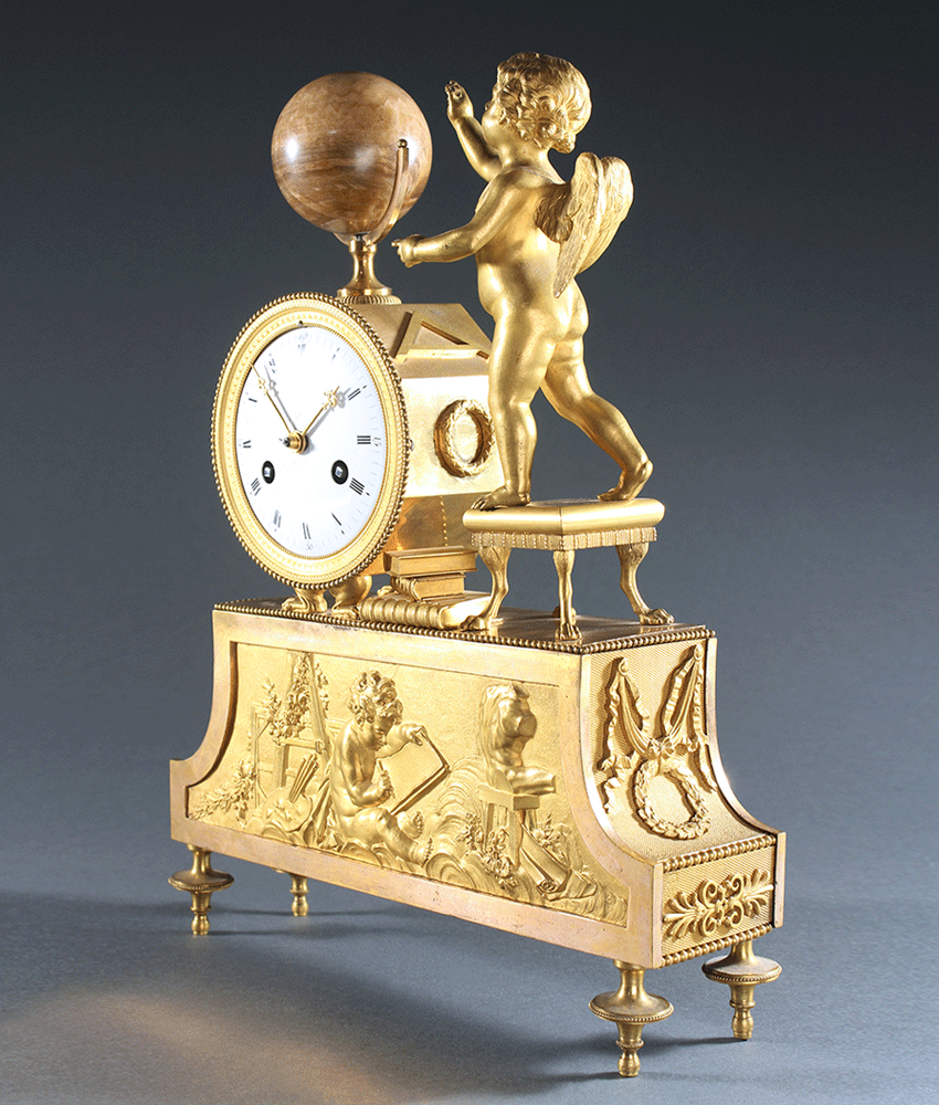 Late 18th/early 19th Century French Directoire period gilt bronze allegory of the Arts and Sciences mantel clock. Surmounted by a putto figure standing on a classical stool pointing at a sphere. The case decorated with symbols of science and the arts. Down swept base with high relief facia plaque depicting a putto drawing. On toupie feet. Early original eight day silk suspension.