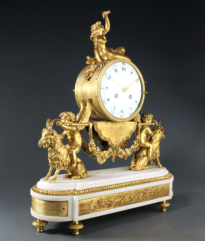 A fine quality large size Louis XVI style French early 19th century white marble and gilt bronze ormolu 'à la bacchante et chevres' clock. Surmounted by a female bacchante pouring wine from her cup. The movement encased in a drum held aloft by two symetrical winged cherubs sitting on goats. Rich fabric valance and garlands of vines to the centre. The white marble base mounted with gilt bronze ormolu frieze of a bacchante procession. Identical in every way to a clock made by the eminent horologer Charles Leroy. Paris, circa 1800.