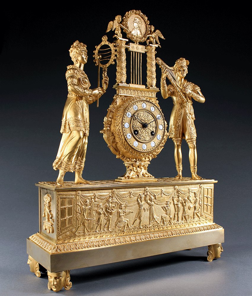 Very rare and unusual French Empire/Restauration gilt bronze ormolu mantel clock in tribute to the composser Joseph Haydn (1732-1809). Surmounted by two troubador style musicians either side of a monument in the form of lyre with two winged putti and a releif portrait of Hayden which contains the eight day two train silk suspension movement. The whole sits on an elaborate base with a geometric floor and a relief scene of a celebration of music. This in turn sits on four magnificent feet in the form of theatrical masks. France, Empire/Restoration period, circa 1830.