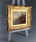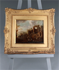 Sweet early 19th Century, small italianate landscape Grand Tour capriccio painting of figures in front of ancient ruins. Possibly the Palatine Hill in Rome. Oil on board, stamped 'John Metcalfe' to reverse and remains of an old label for 'T' Rushworth and Sons' Durham. John Metcalfe the maker of the panel is referenced in Edward Baines Directory of the County of York as working in Frenchgate in 1823. Timothy Rushworth is registered as working in Durham in 1840. English or French in the manner, or a follower, of Herman van Swanevelt (1600-1665).