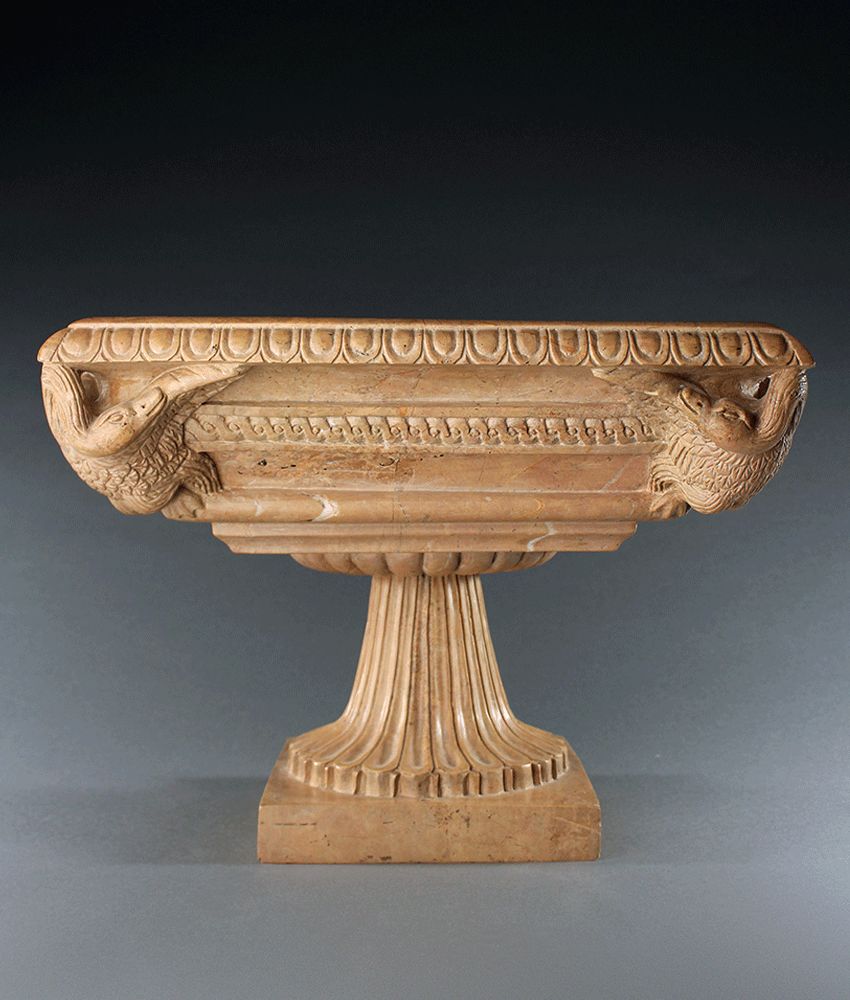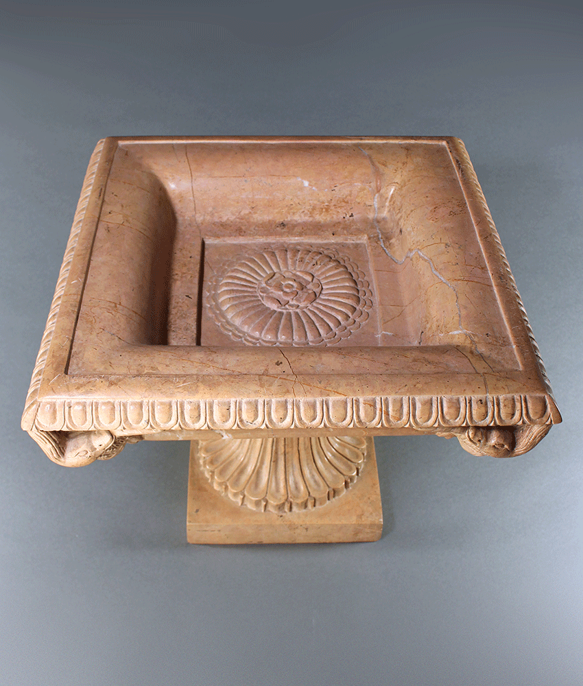 A labrum was a water vessel used in ancient Roman baths and gardens. A very similar larger version can be seen in the 'Gabinetto delle Maschere' in the Vatican Museum in Rome. Carved block base with a fluted spreading stem. Stepped square form bowl with a lobed ribbed underside. Stylised central flower and a classical egg and dart style rim. Carved swans on each corner. Good example of a rare Grand Tour item.