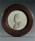 Rare French 19th century white marble bas-relief profile portrait plaque of the Emperor Napoleon. Nicely carved portrait of Napoleon in military uniform very similar to official portraits of Napoleon struck on commemorative medals towards the end of the Empire period by Depaulis (see Bramson 1323 The Battle of Wurtchen). Nicely mellowed white marble plaque presented in its original reeded wooden frame with a hanging loop.