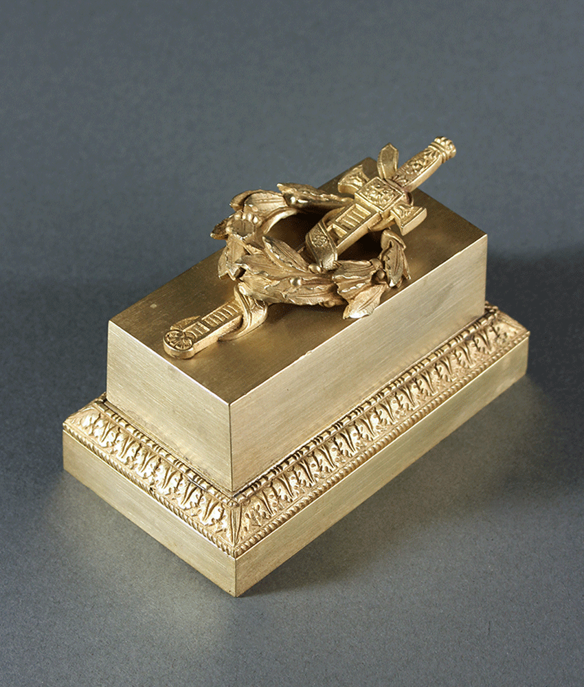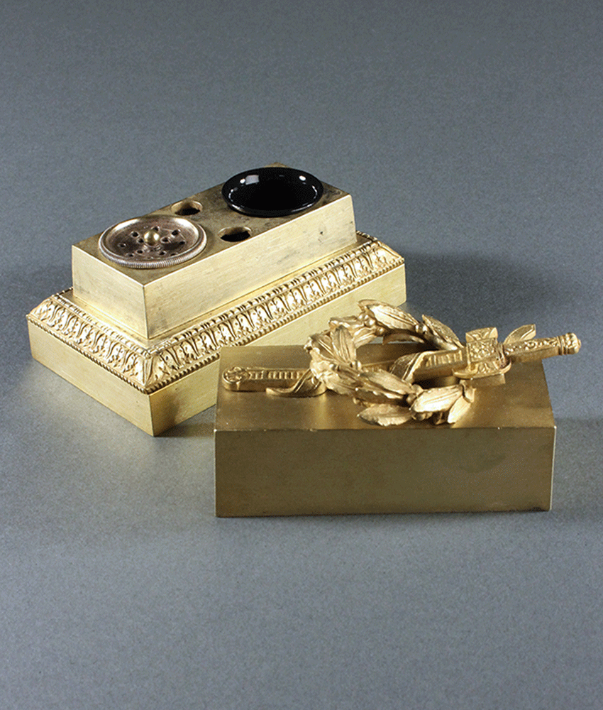 Superb small French Empire early 19th century bronze ormolu campaign inkwell surmounted by a classical victors laurel crown and a sword after the antique. Original pounce pot and black ceramic ink pot.