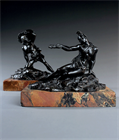 Rare pair of enigmatic early 19th century patinated cabinet bronzes of Greek warriors by the French Neoclassical artist Jean Pierre Cortot (1787-1843). Probably once again on the theme of the Battle of Marathon with one figure a version of Cortot's famous marble original 'Le Soldat de Marathon Annonçant la Victoire' (A soldier returns with news of victory) and the other probably Miltiades the Younger, victor of the Battle of Marathon. Well modelled, rare pair, both signed 'Cortot'. Presented on beautifully figured Breccia di Marmo Giallo block bases. France, circa 1830.