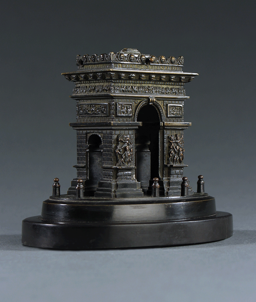Small size, fine quality 19th Century Grand Tour patinated bronze architectural model of the ‘L’Arc de Triomphe’ in Paris. Superbly cast and wonderfully detailed with a deep brown patination. Built to commemorate French soldiers that had died in the Revolutionary and Napoleonic Wars, the imposing arch, completed in 1836 under the rule of Louis Phillipe, became a highlight stop for individuals on the Grand Tour in the second half of the 19th century. Good example of an increasingly difficult to find Grand Tour model. French, circa 1870.