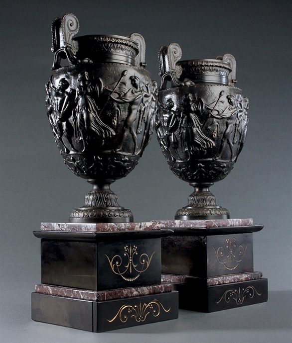 A good quality pair of large late 19th century bronze or bronzed metal Townley Vases after the antique Roman marble original discovered in 1773 by Gavin Hamilton, the Scottish antiquarian, whilst excavating a Roman Villa at Monte Cagnolosoutheast of Rome and now on permanet display in the British Museum in London. Beautiful classical vase of krater form with a Bacchanalian procession bas-relief figural frieze and elaborate twin scrolling volute handles. Raised on black slate square block plinths etched in gold with typical late 19th century period designs. French, circa 1880.