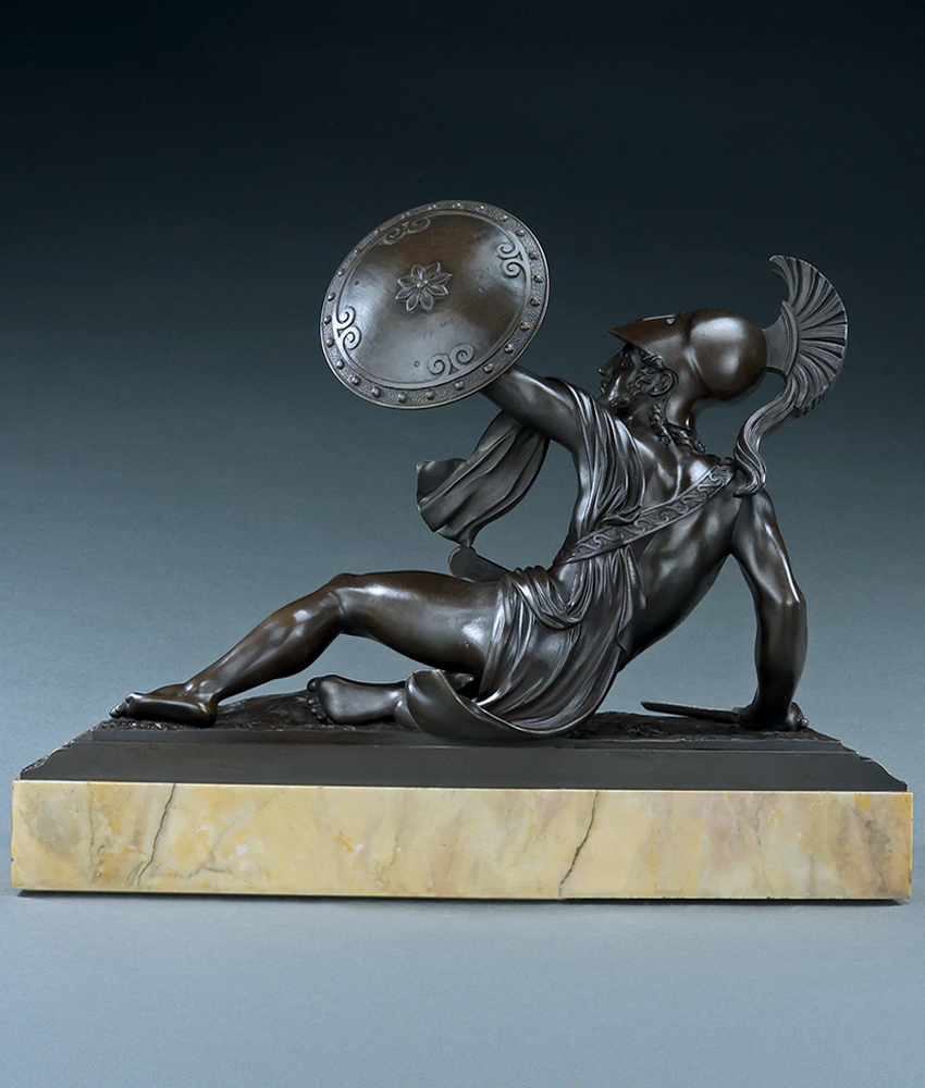 A fine quality neoclassical early 19th century French patinated bronze of a fallen Greek or Trojan warrior in a defensive pose with his shield raised above his head. Similar in style to the statue of Alexander the Great by Charles Leboeuf dit Nanteuil in the Jardin des Tuileries. This bronze is sometimes seen paired with a bronze of Achilles and is therefore generally referred to as the Trojan Hector. Beautiful, even patina, well cast and chased. Superb bronze of very high quality. Presented on a bronze battlefield base with a classical architrave and Sienna marble block base. Paris, France, circa 1830.