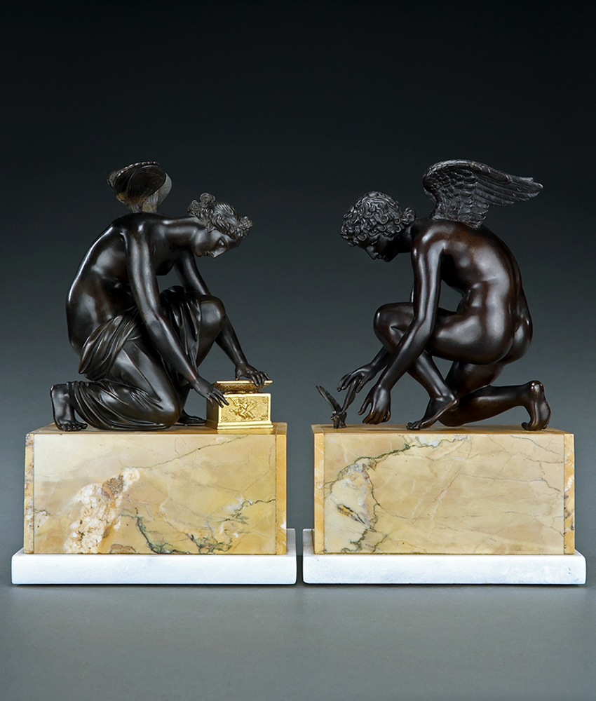 Rare very decorative matched pair of French 19th century patinated bronzes of L’Amour au Papillon after Antoine-Denis Chaudet (1763-1810) and Psyche with the Golden Box. The finely cast bronze depiction of a Cupid kneeling holding the wings of a butterfly is a representation of Cupid capturing Psyche. L’Amour was first presented as a plaster model at the Salon of 1802, to great acclaim. Unfortunately, the artist did not live to see it realised in marble by his friend Pierre Cartellier (French, 1757-1831) in the salon in 1817. Louis XVIII acquired L’Amour for the state and exhibited it at Versailles, where it resided until it was transferred to the Louvre, Paris. The equally fine bronze of Psyche, with an ormolu casket, depicts the fourth task given to her by the Goddess Venus to prove she was worthy of her son. Both sit on early 19th century Sienna marble veneered blocks which in turn sit on white marble slab bases. A classic pairing, probably adapted from clocks, but still marvellously rare, impressive and highly decorative. Super quality castings. Psyche, France, circa 1820. Cupid, France, circa 1870.
