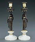 An elegant pair of early 19th century English Regency period patinated and ormolu gilt bronze neoclassical caryatid candlesticks. White marble gilt bronze banded socle bases surmounted by classically inspired vestal virgin type female figures with gilt bronze waistbands. Tassled cushions and drip tray topped with a simple fluted candle cup. Attractive rare examples of Regency candlesticks. English, circa 1825.